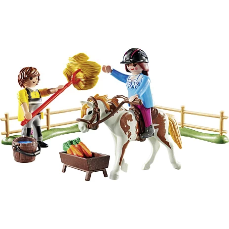 Legesættet består af to PLAYMOBIL-figurer, en hest, hegnselementer, en høfork med hø, gulerødder og mange andre sjove tilbehørsdele. PLAYMOBIL Starter Packs er den perfekte start ind i det store PLAYMOBIL-univers. Med det alderssvarende tilbehør er Starter Packs allerede velegnede til børn fra 3 år.