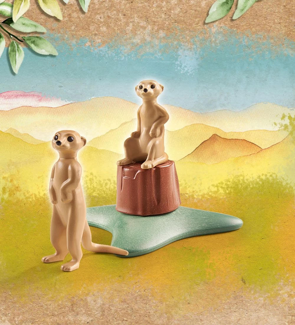 Lærerigt Playmobil Wiltopia sæt med en lille model af to surikater med tilbehør – i alt 5 dele.