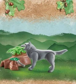 Lærerigt Playmobil Wiltopia sæt med en lille model af en ulv med tilbehør – i alt 7 dele.